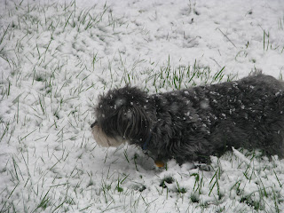 After muttering wuss under my breath (and snapping these pics from the protection of the covered porch ) he was soon out and in the snow covered grass. His short legs had him scampering back into the house as soon as he was done.
